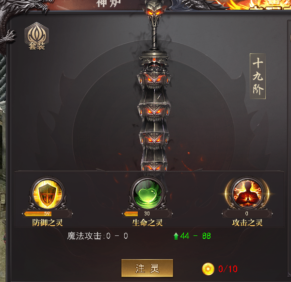 开服60天以上区服可进行神炉注灵,神炉注灵分防御之灵、生命之灵、攻击之灵,三种灵可在不同神炉提升大量对应神炉的注灵属性