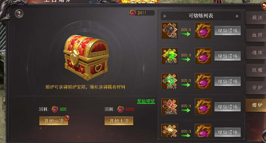 满级神炉可使用神炉相应升级材料提纯提纯获得纯净的神炉提纯精华,神炉提纯精华可进行开炉,获得大量神炉注灵精华