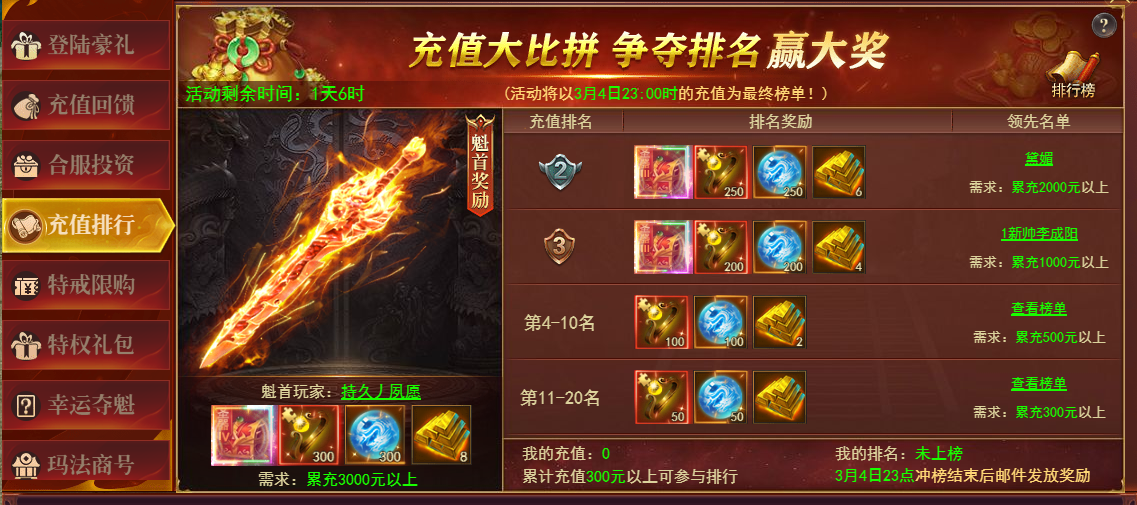 活动期间累计充值满足条件即可参与排行活动,充值大比拼,争夺排名赢奖励!