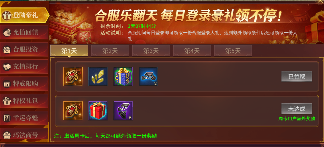 合服期间每日登陆都可领取一份合服登陆大礼,激活周卡还可以额外领取一份大礼