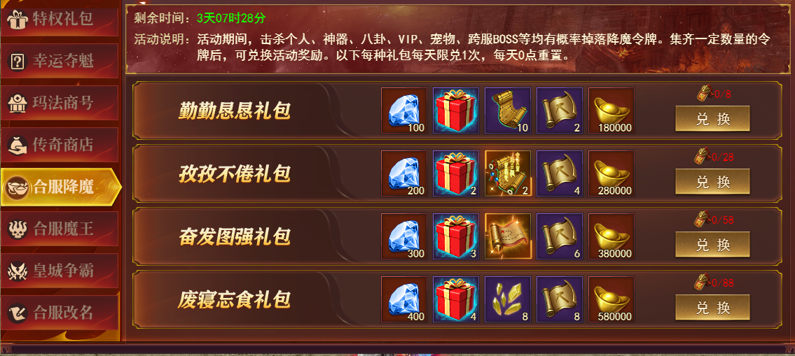 活动期间,每击杀一个个人、神器、八卦、vip、宠物、跨服boss即可获得一个降魔令牌,凑齐一定数量降魔令牌,可兑换不同礼包,每种礼包每天限兑换一次。