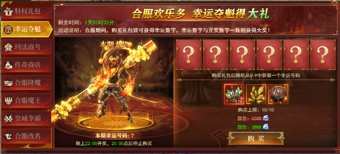 合服期间,购买礼包皆可获得幸运数字,幸运数字与开奖数字一致则可获得大奖!