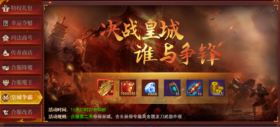 合服第四天夺得皇城,会长获得专属黄金屠龙武器外观,还有钻石等丰厚奖励