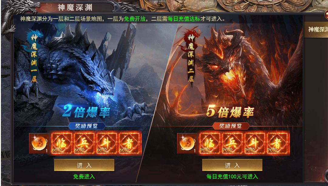 3) 限制:第二层需要每日充值达标才可进入,可掉落更高等级的真言装备!