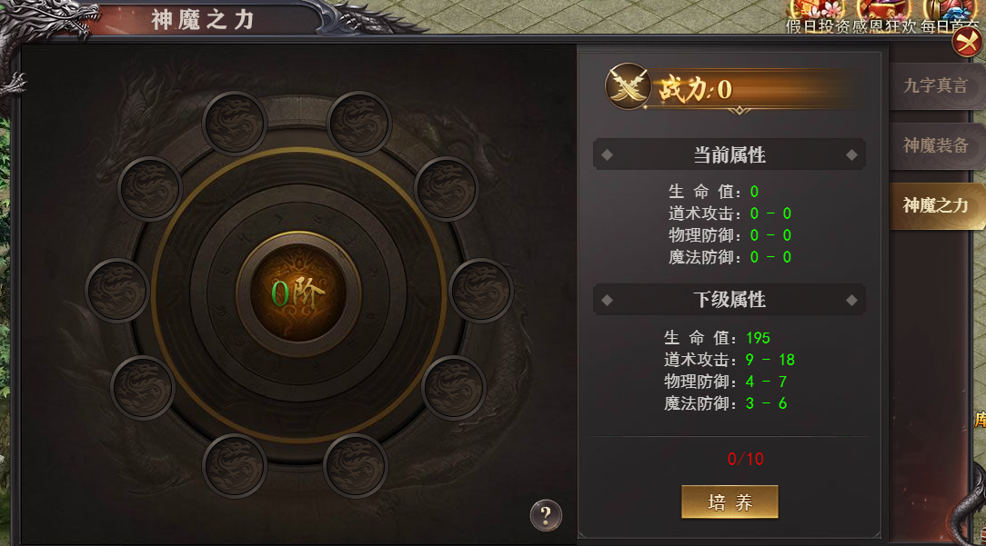 2、 神魔培养:培养消耗神魔之血,增加属性。