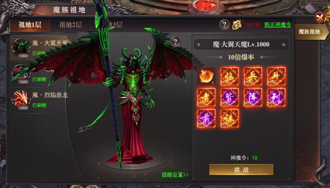 3、 神魔祖地:每天可进入挑战BOSS,掉落真言装备。