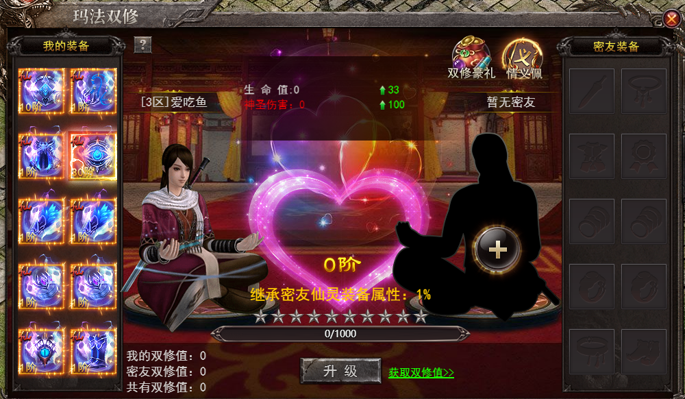 4、双修等级提升能增加基础属性,并且可以继承对方仙灵装备的百分比基础属性