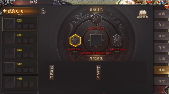 2、神纹槽位:需要使用天工锥开启后,可进行穿戴神纹(天工锥通过游戏内运营活动获取,并且槽位是永久开启)