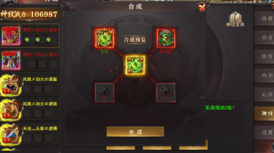 (7)神纹穿戴后可进行升级,升级增加基础属性以及技能加成效果(已穿戴神纹+神纹碎片进行合成下一阶)神纹碎片可通过分解多余的神纹进行获取