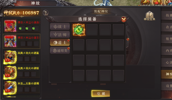 (6)每种职业都有对应的神纹,获得后可点击穿戴