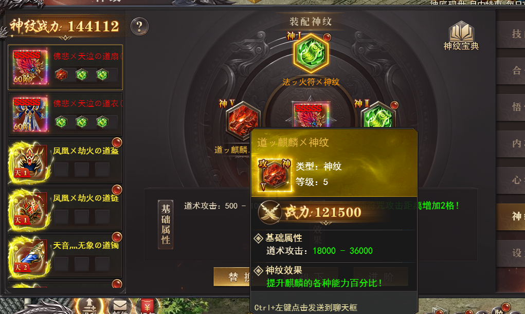 (3)穿戴后可拥有神纹的基础属性以及职业技能加成效果