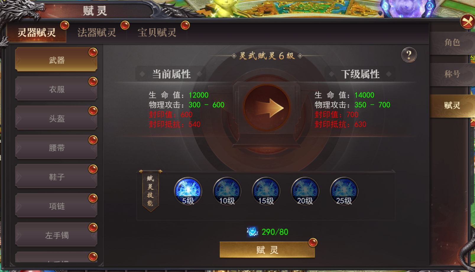 (4)赋灵达到对应等级可激活赋灵技能,加强封印值和封印抗性