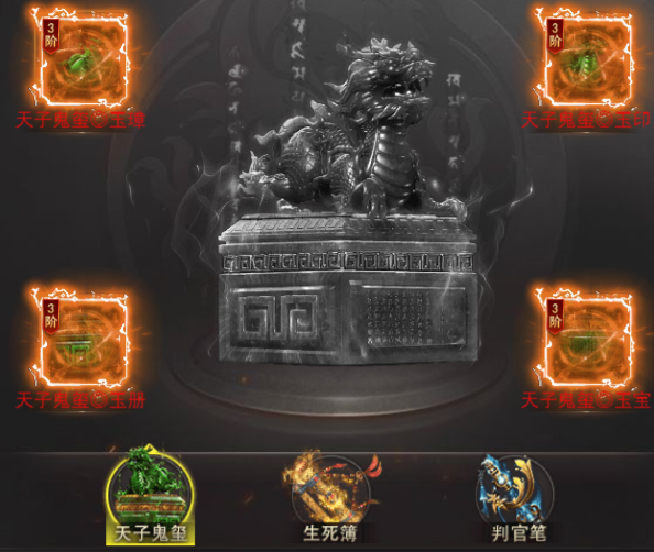 (1)一共分为天子鬼玺、生死簿、判官笔;每一个装备分为4个部位,激活4个部位即可获取套装属性