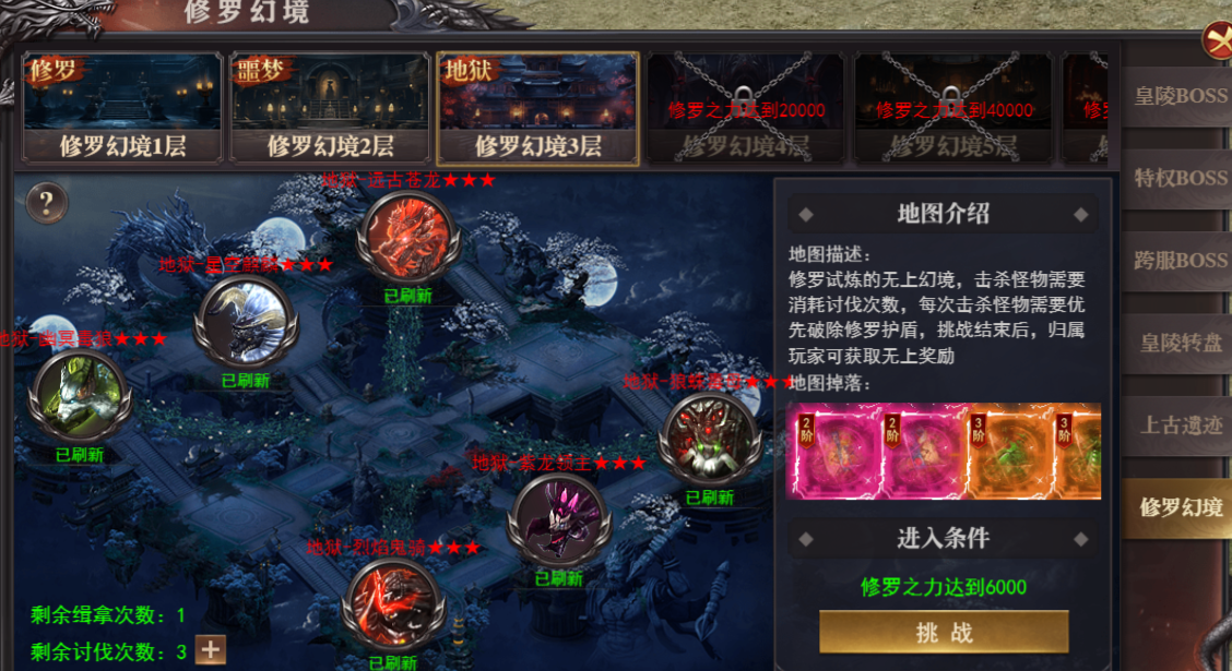(1)达到对应修罗之力才可进入(2)极品掉落:阎罗装备
