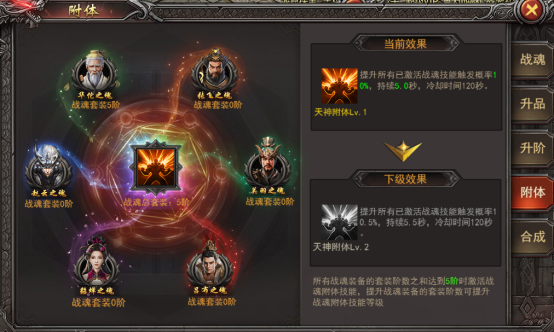 (4).战魂养成--附体:所有战魂装备的套装阶数之和达到5阶时激活战魂附体技能,提升战魂装备的套装阶数可提升战魂附体技能等级