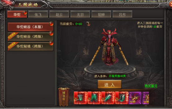 (1).新地图--三国战场:分为本服+跨服,产出战魂装备,每分钟需要消耗一定疲劳值,地图不同,疲劳值消耗不同