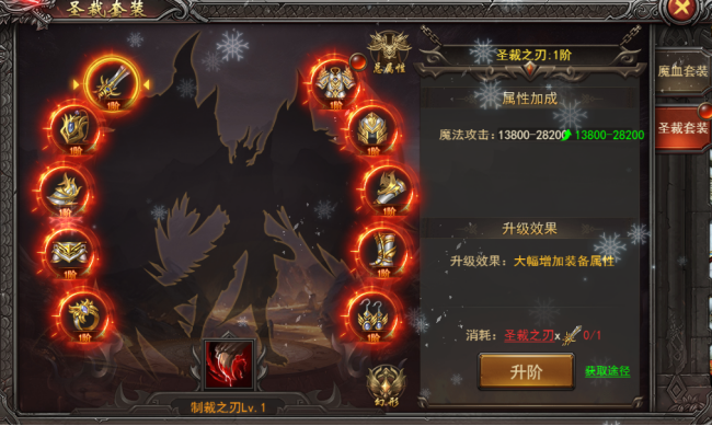 (1).3v3套装--圣裁套装:可通过战功兑换圣裁幸运箱、购买每日竞技礼包概率获取,圣裁装备可升阶,需消耗对应相同部件