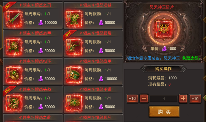 5. 新增--跨服领地战商城:消耗紫晶兑换领主装备和珍惜材料;