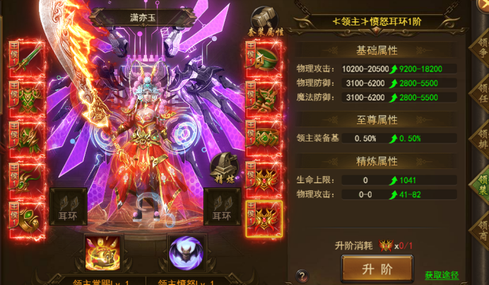 (1).领主装备升阶:通过消耗同等部位的装备进行升阶,装备等阶越高,装备属性加成越高,技能效果越强;