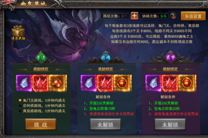 a. 幽冥禁地分有3个难度,普通--开服240天30转500级开启、困难--开服250天驭鬼总阶数10阶开启、噩梦----开服260天驭鬼总阶数20阶开启;