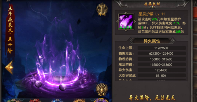 专属技能--星辰护盾:被攻击时有几率触发星辰护盾BUFF,增加异火伤害减免熟悉,持续一段时间,对范围内的敌方目标造成异火伤害,有一定的冷却时间,等阶越高,技能效果越强;