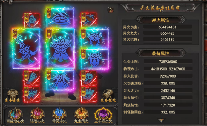 a. 穿戴异火装备可获得异火伤害,异火之力,灼烧抵抗等稀有属性,灼烧抵抗是挑战异火塔必备属性;