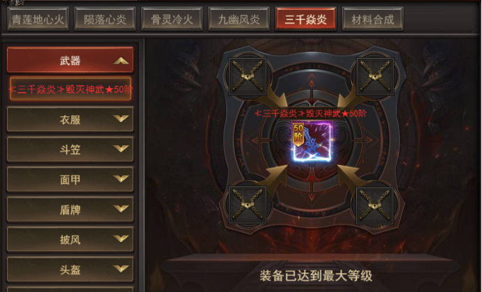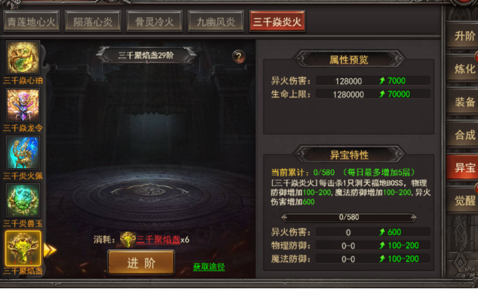 7. 新增玩法--异火-合成--三千焱炎:可使用材料进行合成高级装备;