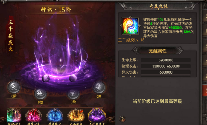 a. 三千焱炎:使用三千焱炎进行升阶,等阶越高,技能效果越高;