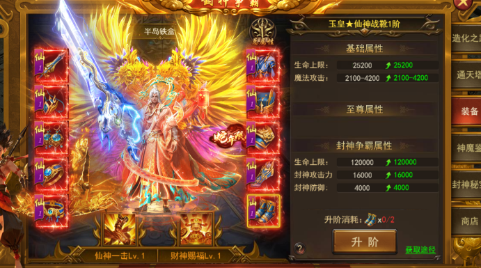 b. 可以消耗对应部位装备对仙神装备进行升阶,等阶越高,属性越强,技能效果越强;
