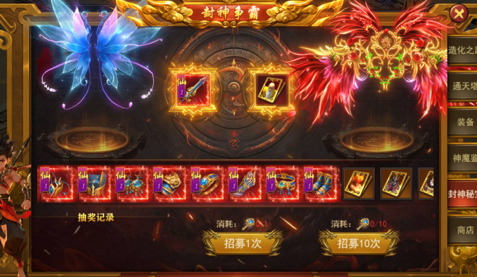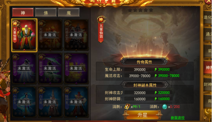 6. 新增玩法--封神争霸--封神秘宝:消耗仙神令抽取仙神装备/神魔图鉴和升星材料;