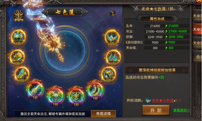 a. 穿戴全套5阶及以上天命装备,可激活套装属性,等级越高,属性越高;