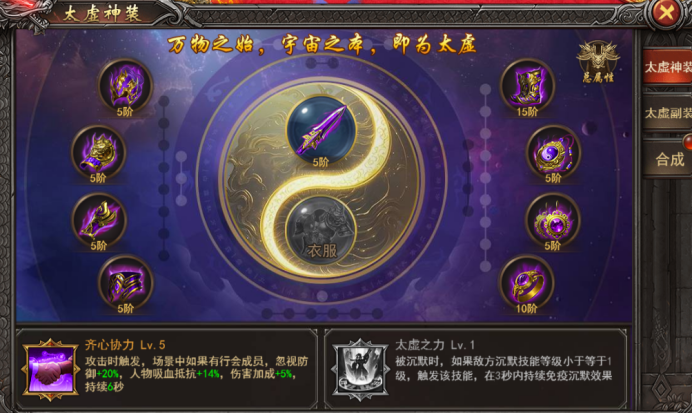 a. 太虚之力:穿戴1阶10件套即可激活,被沉默时,如果敌方沉默技能等级小于等于一定等级时,触发该技能时,在一定时间内持续免疫沉默效果,技能等阶越高,免疫敌方沉默技能等级越高