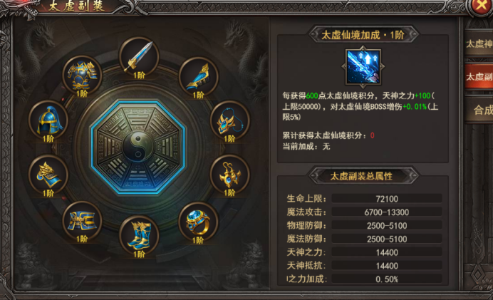 a.太虚仙境加成:穿戴1阶10件套太虚副装即可激活,每获得600点太虚仙境积分,天神之力+100(上限50000分),对太虚仙境boss增伤+0.01%(上限5%),技能等级越高,上限越高