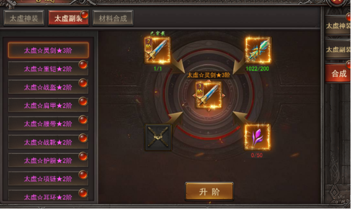 b. 太虚副装可通过1阶+同等装备碎片+进阶材料合成高阶;