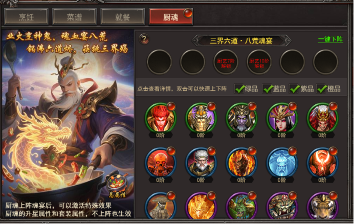 b. 厨魂上阵后,可以激活特殊效果,升星和套装属性,不上阵也生效;