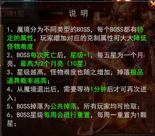 b、boss每次死亡后星级增加1,五星为一个月亮,最高2个月亮及10星。boss星级每周会进行重置,每周一重置为1星;