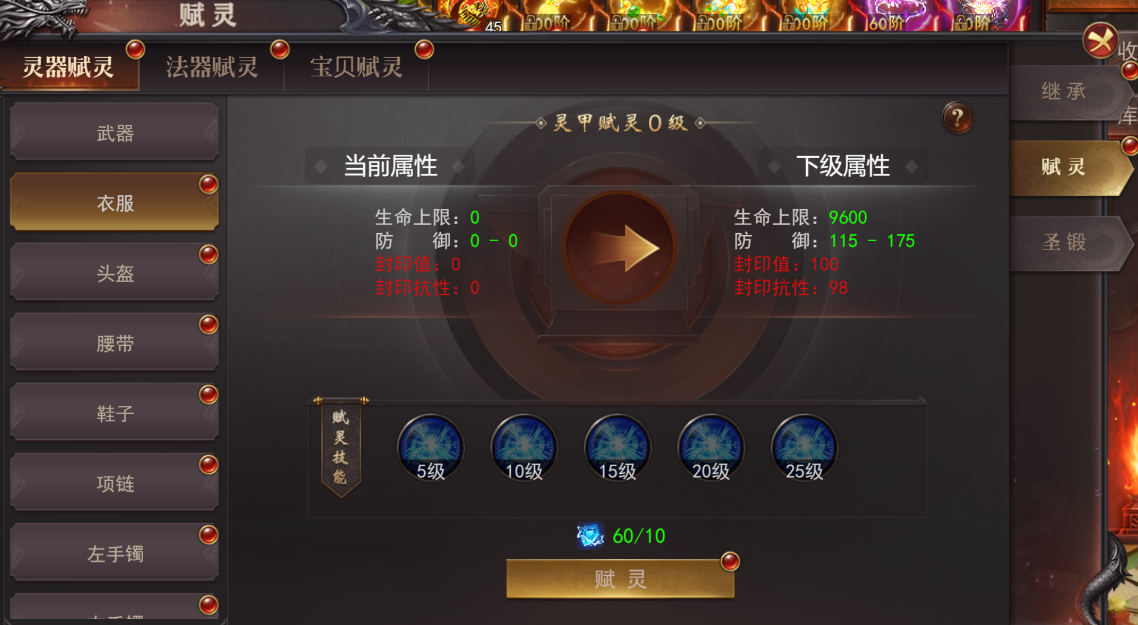 1.穿戴对应装备可进行赋灵,封印属性和赋灵技下级属性能只对该部位生效