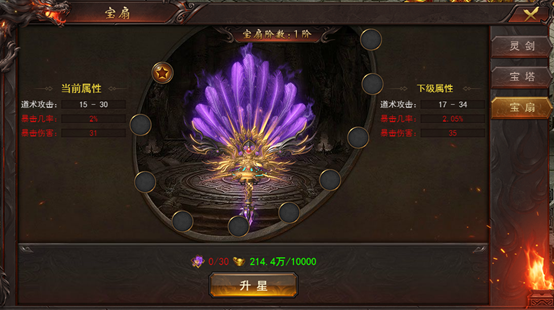 角色达到250级开启灵宝系统,灵宝系统分为:灵剑,宝塔,宝扇。玩家使用灵剑精华,宝塔精华,宝扇精华以及元宝可以对对应的灵宝升星,获得大量的属性。灵剑升星可以增加生命上限,切割伤害,怪伤减免。宝塔升星可以增加物理(魔法)防御,怪伤加成。宝扇升星增加暴击几率和暴击伤害。