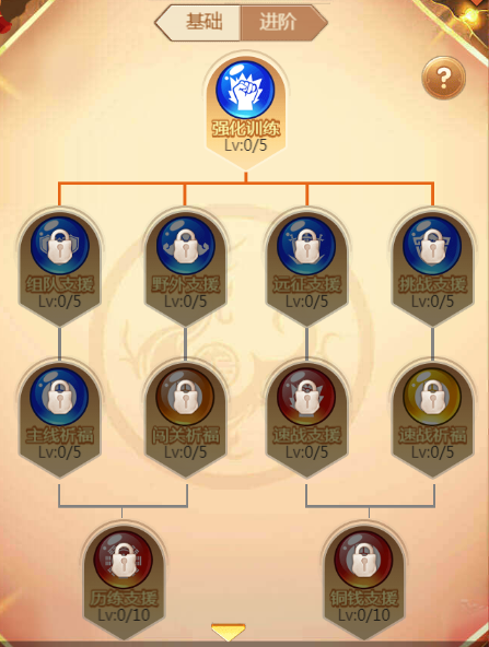 群英支援II(需要宝物支援II10级);竞技支援II(需要铜钱支援II10级);威望支援II(需要突破支援II+锤炼支援II10级);