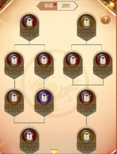 群英加速II(需要群英支援II+竞技支援II各5级);科技加速II(需要威望支援II5级);
